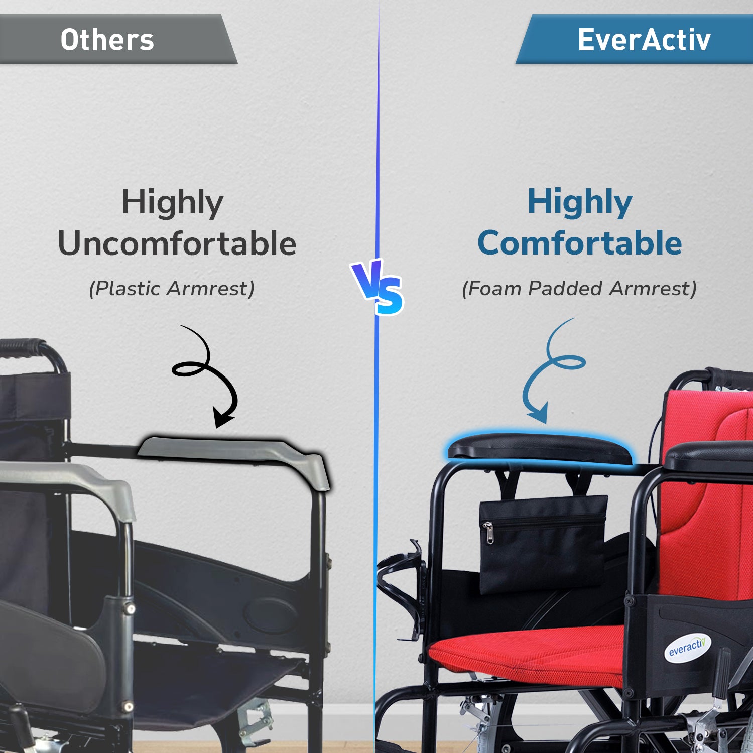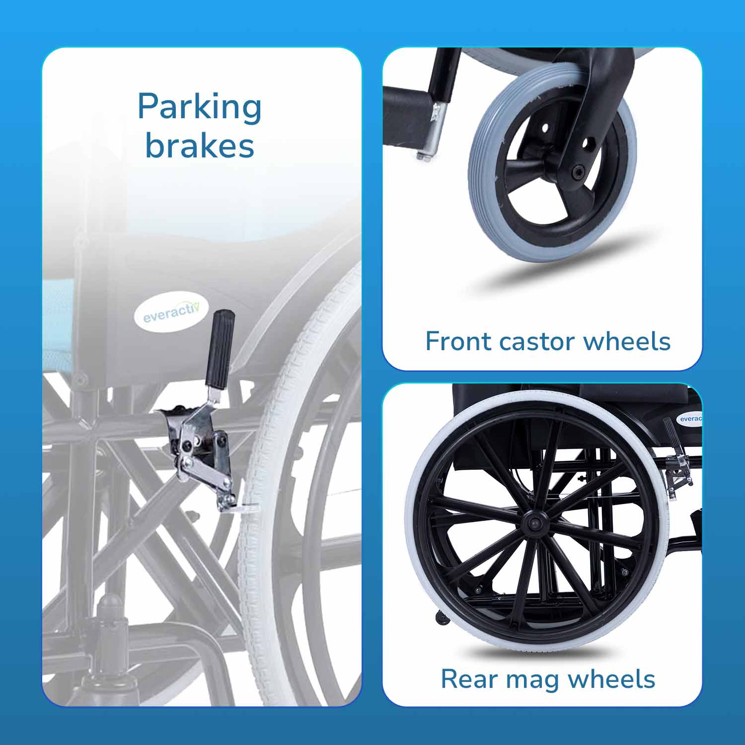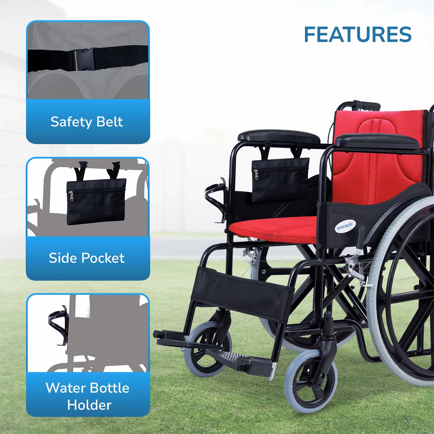 Everactiv Everyday Premium Foldable Wheelchair with 2 Extra Seats, 6 Wheels & Brakes for extra safety, Side Pouch, Bottle Holder
